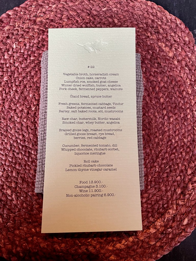 Dill only offers a tasting menu and beverages, but they do make certain accommodations for some dietary restrictions. The menu was 13,900 ISK (~$105) and the drink pairing was 11,900 ISK (~$90) at the time of my visit. I believe the cost can sometimes vary based on the ingredients, time of year, or just plain inflation because at the time of writing this post in April 2022, their tasting menu is 15.900 ISK (~$120) according to their website. It’s not a small price tag, but given the food prices in Iceland in general and the fact that it’s fine dining, I think it’s pretty reasonable. We opted to have the wine and beverage pairing as well, but I thought it was pretty cool that they have a non-alcoholic drink pairing that focuses on kombucha!