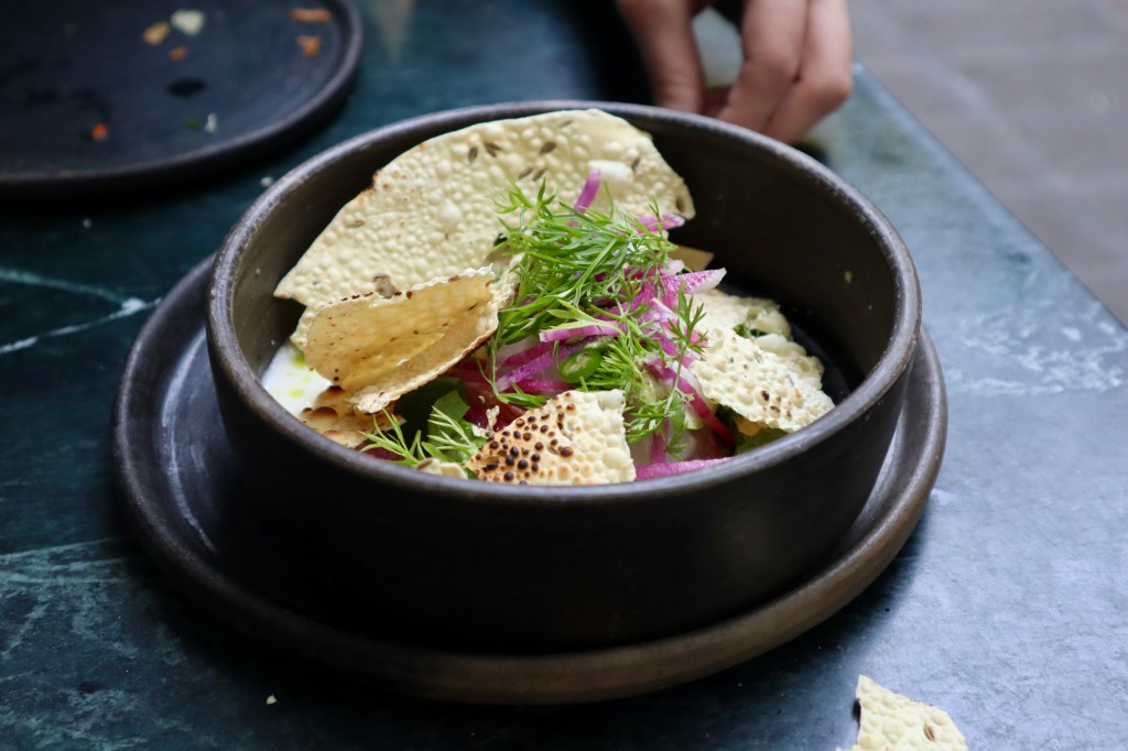 The menu is composed of shared plates and natural wines, and it changes frequently based on what ingredients are in season. We ordered four plates and a bottle of wine between the two of us and left super stuffed. Everything was incredible, but if I had to recommend something specific, get the aguachile and masala fried chicken together so you can go back and forth between the refreshing aguachile and the spicy, smoky chicken. If you drink, I think the wine is a must—most of their wines are by the bottle, but they have a few options by the glass if you ask.