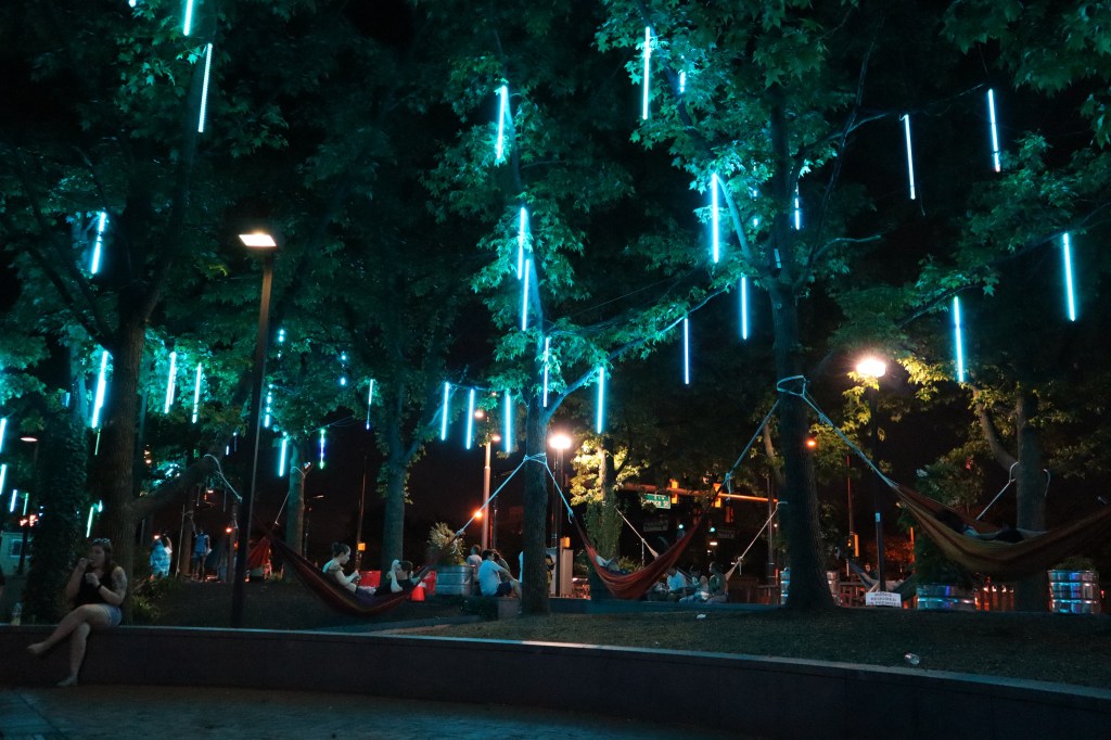 When the sun goes down, the fluorescent lights come on in the park and the beer starts flowing. Couples, families, and tourist groups all find a spot in this colorfully lit park to enjoy drinks and snacks while admiring the nighttime views. There are free hammocks you can lounge on and rental hammock areas that you can reserve for groups. Next to the park, there’s a roller rink in the summer and an ice skating rink in the winter for some extra fun!